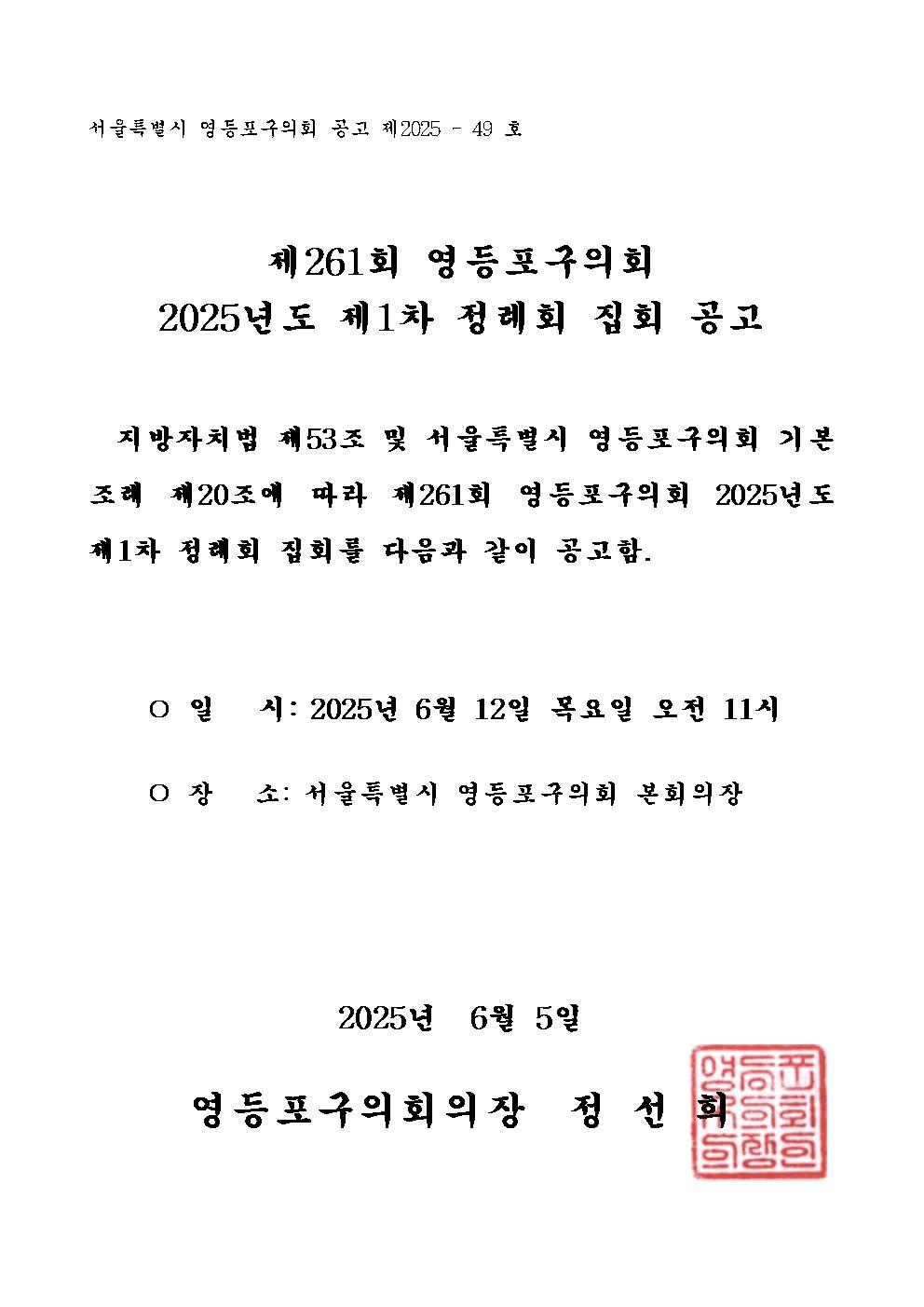 지방자치법 제53조 및 서울특별시 영등포구의회 기본 조례 제20조에 따라 제261회 영등포구의회 2025년도 제1차 정례회 집회를 다음과 같이 공고함.